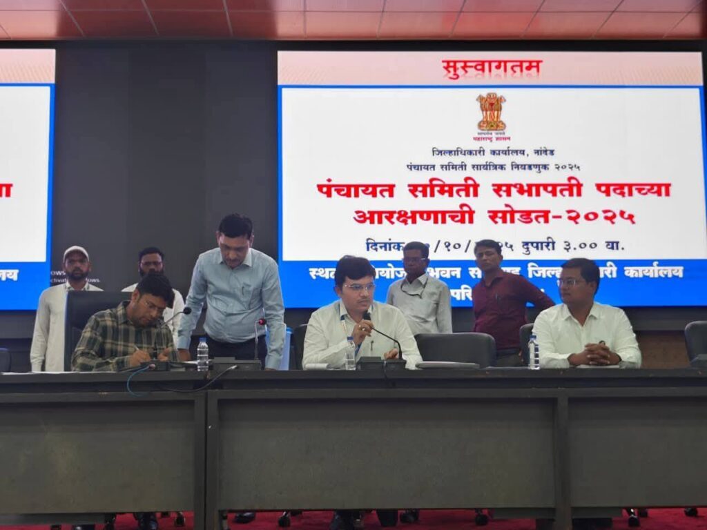 नांदेड़| नांदेड़ जिले की विभिन्न पंचायत समितियों में अध्यक्ष पदों के लिए आरक्षण की घोषणा आज नांदेड़ स्थित जिला कलेक्ट्रेट के नियाज भवन में हुई। यह प्रक्रिया जिला कलेक्टर राहुल कर्डिले की अध्यक्षता में लॉटरी द्वारा संपन्न हुई।